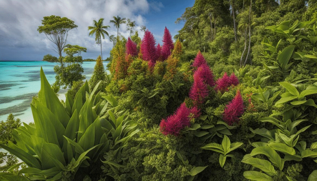 - Pohon kelapa (Cocos nucifera), yang merupakan sumber makanan dan bahan bangunan.