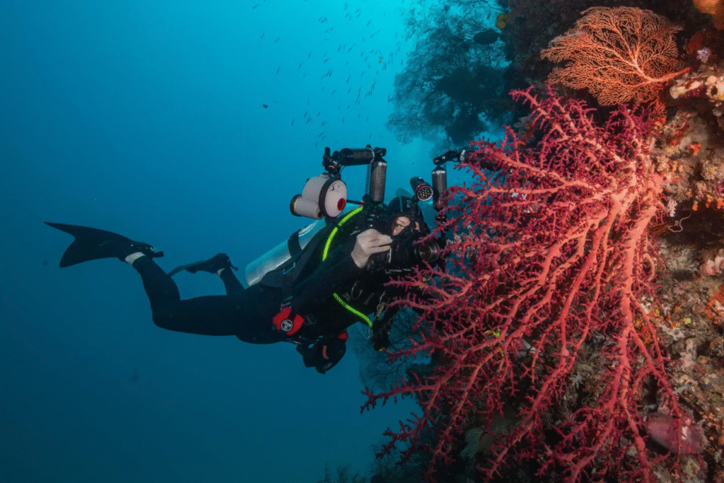 Diving di Komodo menghadirkan pengalaman unik berupa thermocline yang dramatis, di mana suhu air bisa berubah dari 28°C di permukaan menjadi 22°C di kedalaman 30 meter. Fenomena ini menciptakan kondisi ideal untuk soft coral yang berwarna-warni dan schooling fish yang masif. Pink Beach menjadi dive site favorit untuk macro photography dengan nudibranch dan pygmy seahorse yang melimpah.
